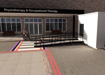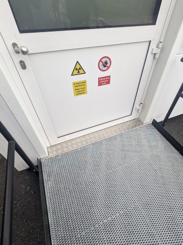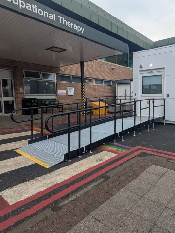 It was requested by the customer that the ramp projected straight from the door and be as short as possible while still compliant, so that patients using the ramp could access the unit as quickly as possible. It was also requested that the ramp be suitable for use by beds/stretchers – the doorway to the unit was automatic opening so the decision was for hospital staff to fully open the doorway and then transport patients into the unit.
