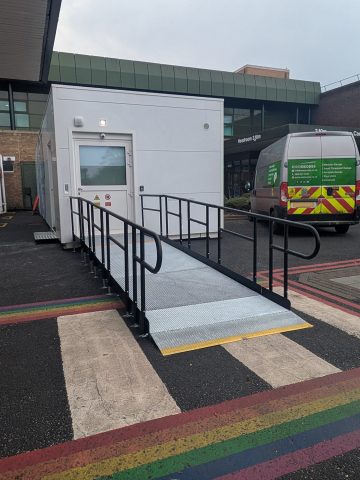 The requirement for this project, was the supply and installation of a semi-permanent metal modular access ramp to a portable medical imaging unit, supplied by one of our partners who we have worked with for several years. This unit was only going to be in place for 4 weeks and was to be removed once the unit was relocated.