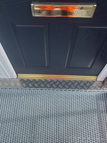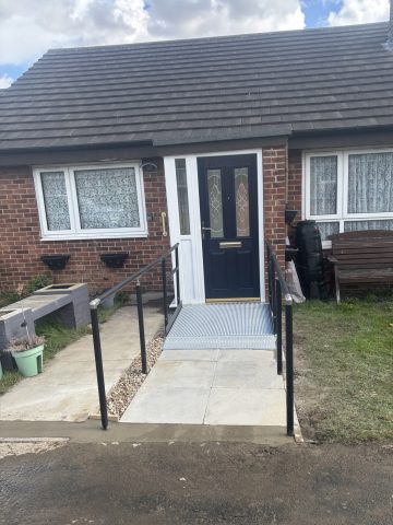 We installed a new low-level threshold external door along with a new internal porch door, removing the high threshold that had previously created difficulties for the customer. This improvement allows for a smooth, straight route out of the property with minimal obstacles. Outside, a straight bridge connects the new doorway to a newly constructed path, providing an uninterrupted and accessible transition. To further enhance safety and ease of movement, extended handrails were added along both sides of the bridge and path, offering additional support and stability.